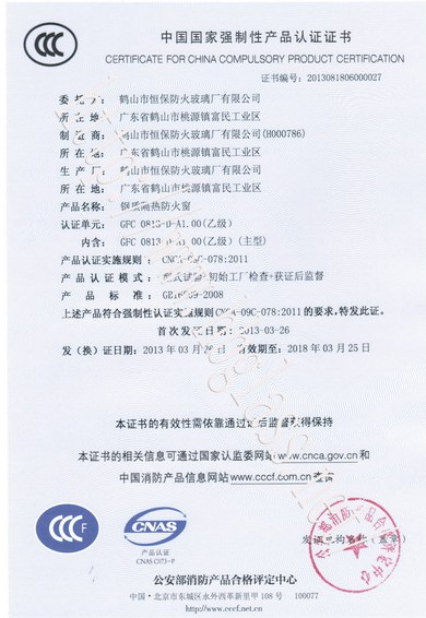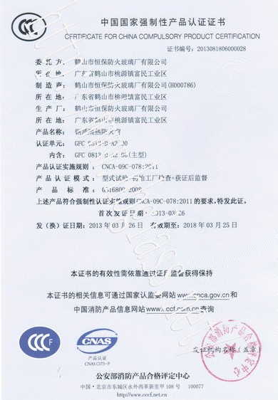 鶴山市恒保防火玻璃廠有限公司在陳總經(jīng)理的領(lǐng)導下,跟全體員工的共同努力下,于2013年3月18日通過國家防火建筑材料質(zhì)量監(jiān)督檢驗中心的檢測,最終通過由公安部消防產(chǎn)品合格評定