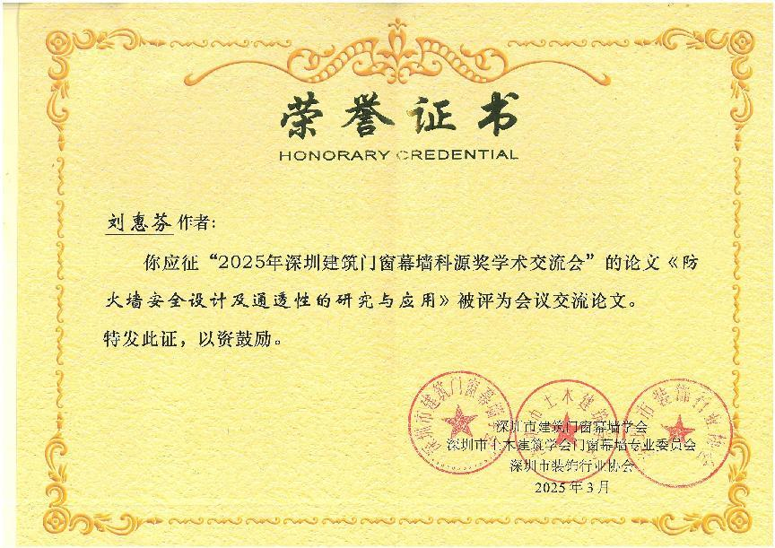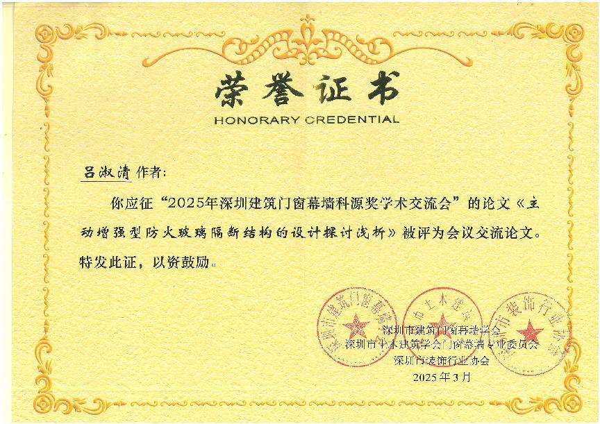 在2025科源獎(jiǎng)獲獎(jiǎng)學(xué)術(shù)論文及學(xué)術(shù)交流先進(jìn)單位頒獎(jiǎng)儀式中,恒保公司共3篇論文榮獲學(xué)會(huì)表彰,其中工程師勞梓明撰寫的《防火玻璃門承載密封隔熱優(yōu)化的分析和應(yīng)用》被評為《現(xiàn)代建筑門窗幕墻技術(shù)與應(yīng)用——2025科源獎(jiǎng)?wù)撐募啡脒x論文!