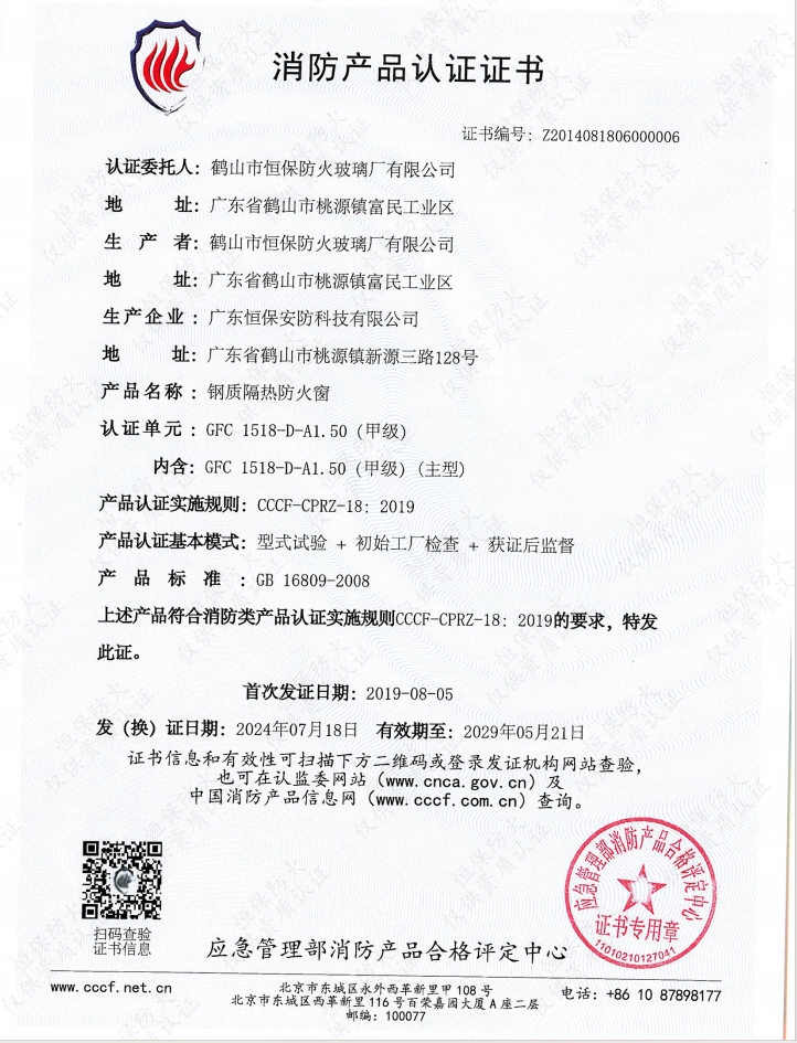 甲級固定防火窗消防產(chǎn)品認證證書: