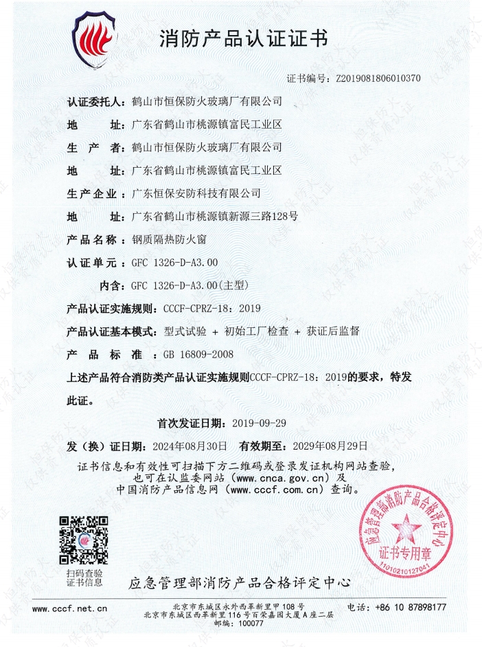 3.00H固定防火窗消防產(chǎn)品認證證書: